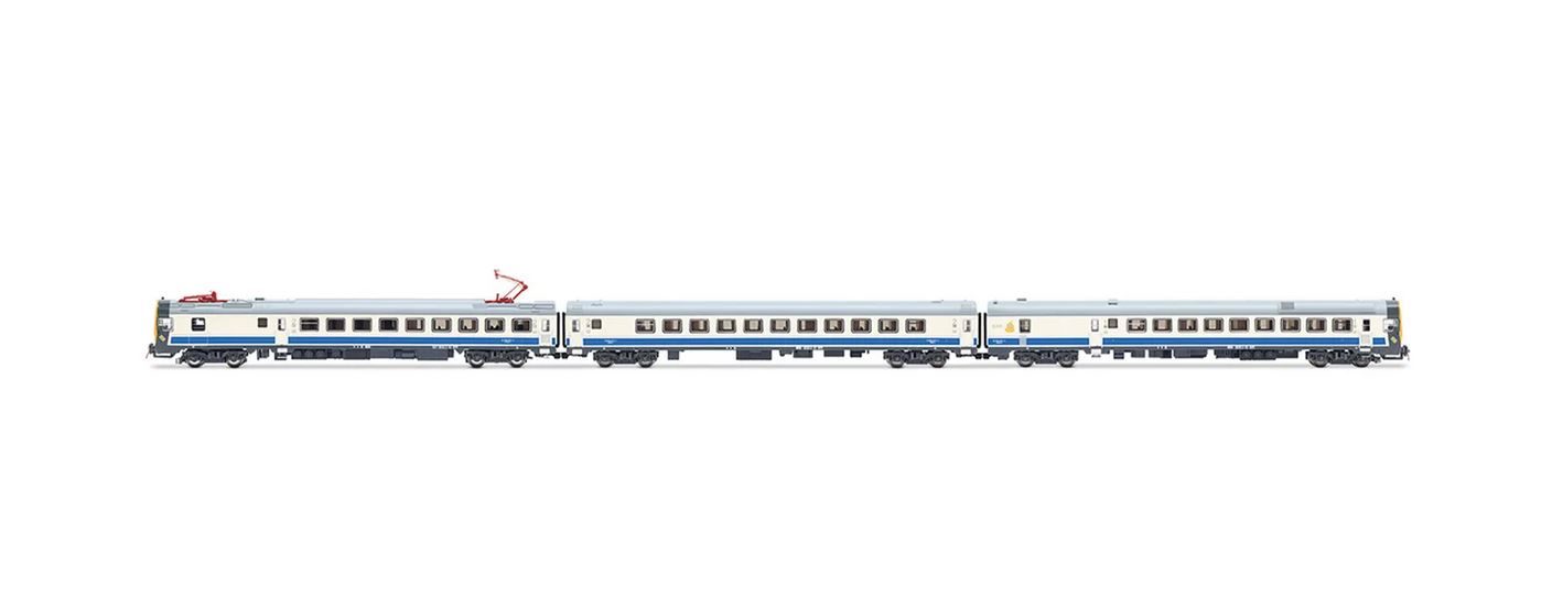 Decoración clásica: Acabado en la característica librea azul y blanca de los trenes de media distancia de los años 90 y 2000 .