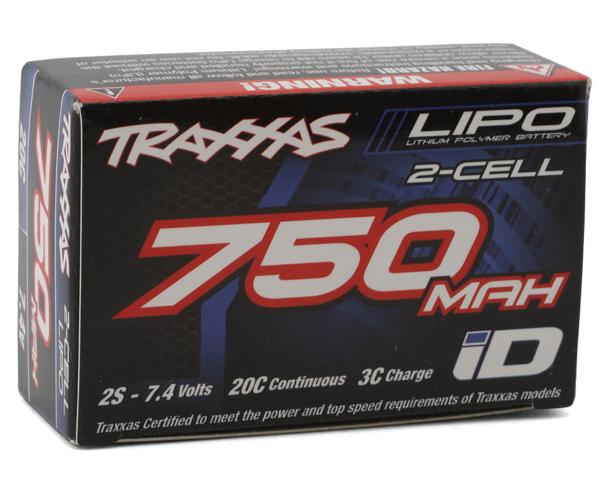 Batería LiPo de 2 celdas (2S) y 7.4V con una capacidad de 750mAh y una tasa de descarga de 20C. Equipada con el conector original de Traxxas. Compacta y ligera, ideal para modelos Traxxas TRX-4M.