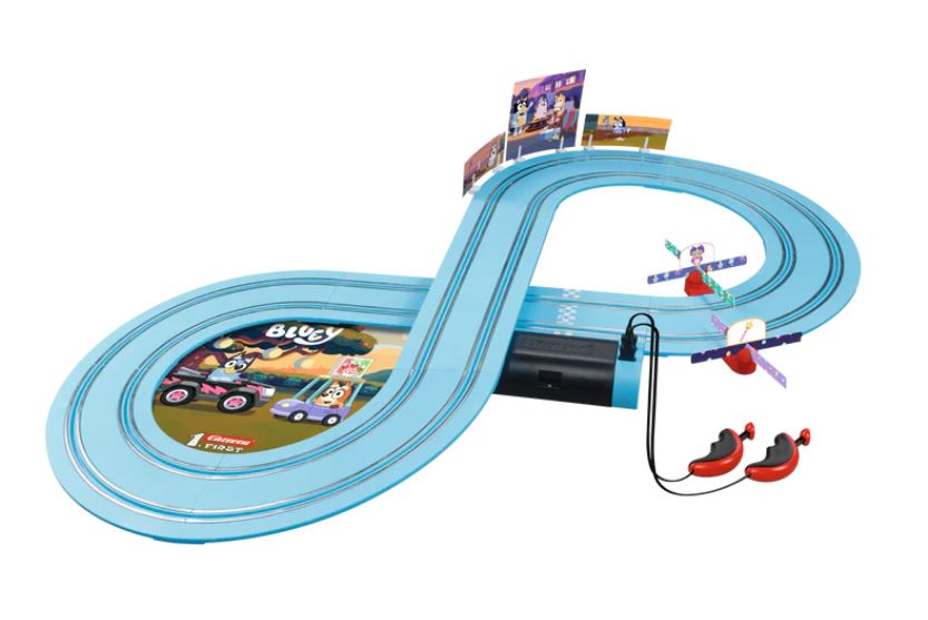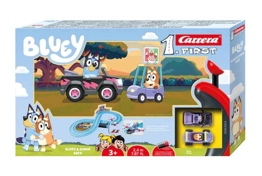 - Personajes de Bluey: Incluye los coches de Bluey y Bingo listos para correr.