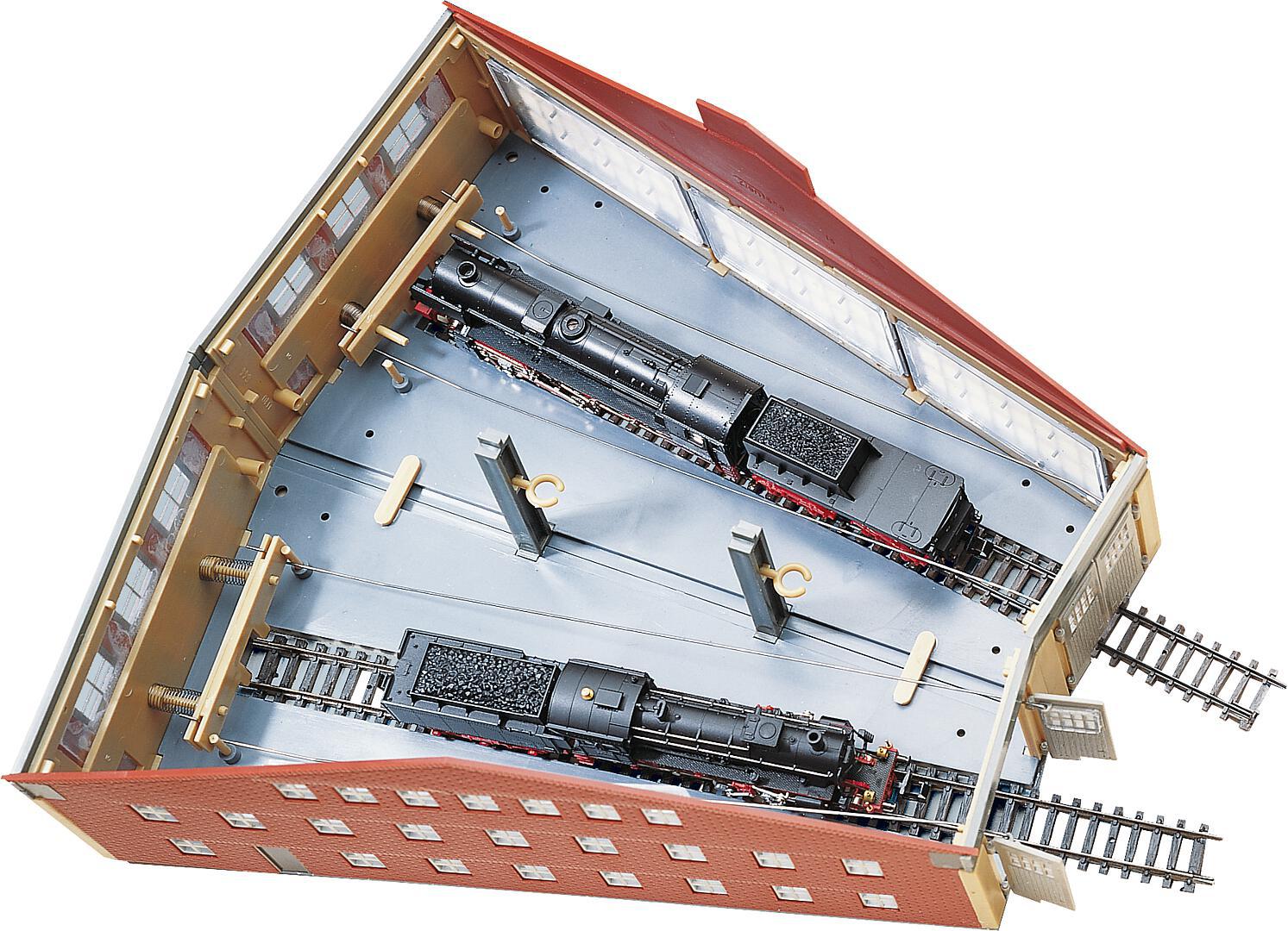 Kit de plástico a escala N para montar una cochera o cobertizo doble para locomotoras. Incluye un mecanismo que permite que las puertas se cierren automáticamente cuando una locomotora entra en el edificio. Diseño clásico ampliable conectando otra unidad igual.