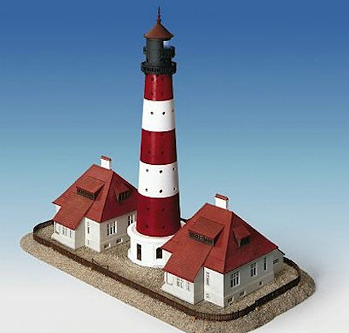 El faro con dos casas de Kibri a escala HO (1/87) es una maqueta de construcción que combina realismo y calidad de detalle, ideal para dar vida a dioramas y maquetas ferroviarias. Este kit reproduce un faro marítimo acompañado de dos edificaciones anexas, representando fielmente la arquitectura típica de las construcciones costeras.