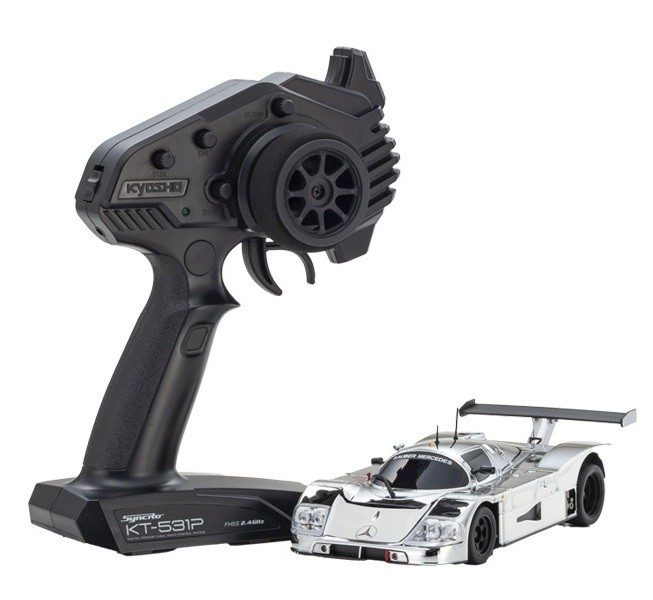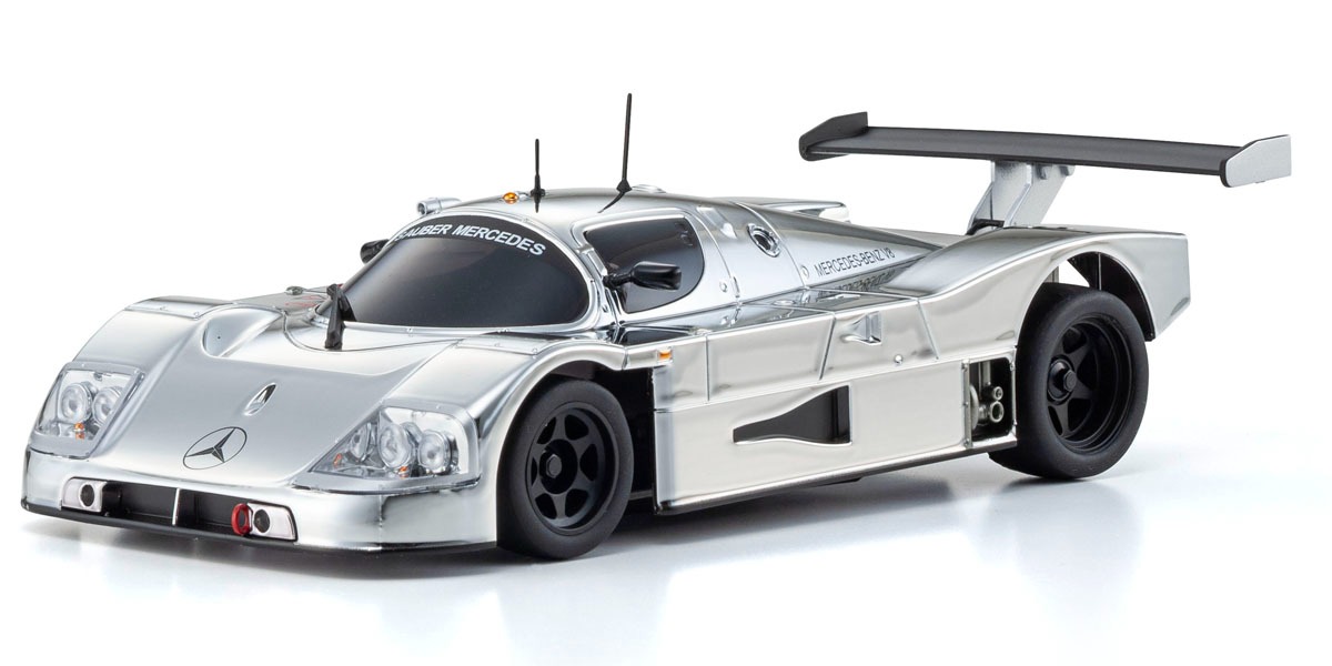 Coche Mini-Z ReadySet de tracción trasera (RWD) listo para usar. Réplica del Sauber-Mercedes Gruppe-C-Rennsportwagen C9 de competición. Incluye mando. Equipado con el moderno chasis MR04 RWD para un manejo ágil y realista en circuitos de interior.
