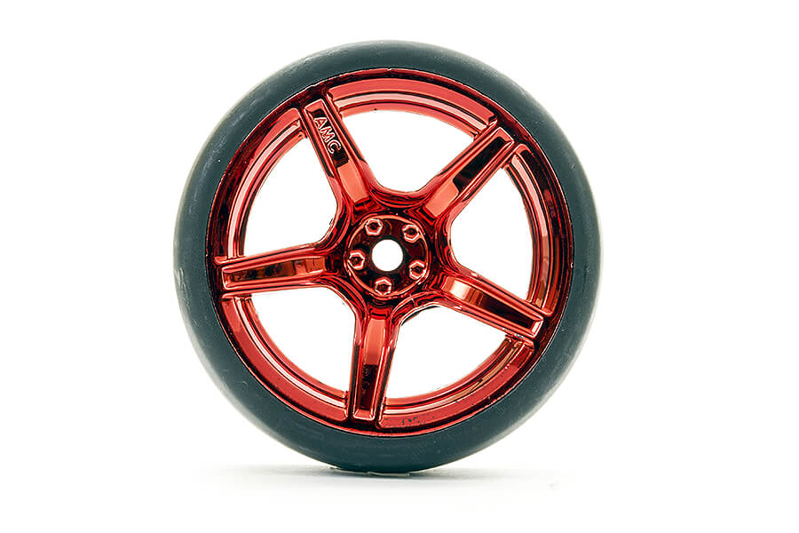 • Incluye llantas montadas: Llantas de 5 radios de 3mm de offset, en acabado rojo metalizado, ya montadas en los neumáticos.