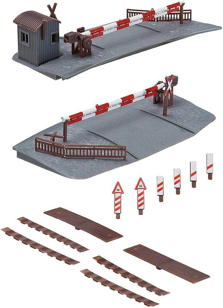 Kit de plástico para montar un paso a nivel con barreras. Incluye caseta de los guardavías.