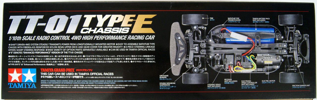 Chasis TT-01 Type-E 4WD: Plataforma de tracción total por cardán, reconocida por su robustez, facilidad de montaje y mantenimiento, así como por su gran potencial de tuning .
