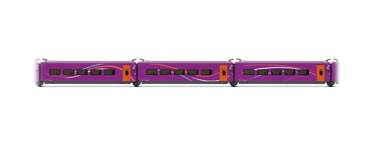 Set complementario de 3 coches del tren de alta velocidad "AVLO" (Alta Velocidad Low Cost) de Renfe, en su característica decoración violeta. Réplica a escala H0 (1:87) fabricada por Electrotren, que reproduce fielmente los vagones de este servicio low-cost de la época VI (2007-presente). Este set corresponde a la tercera y última sección (3/3) de la formación AVLO, diseñado para completar la composición total del tren.
