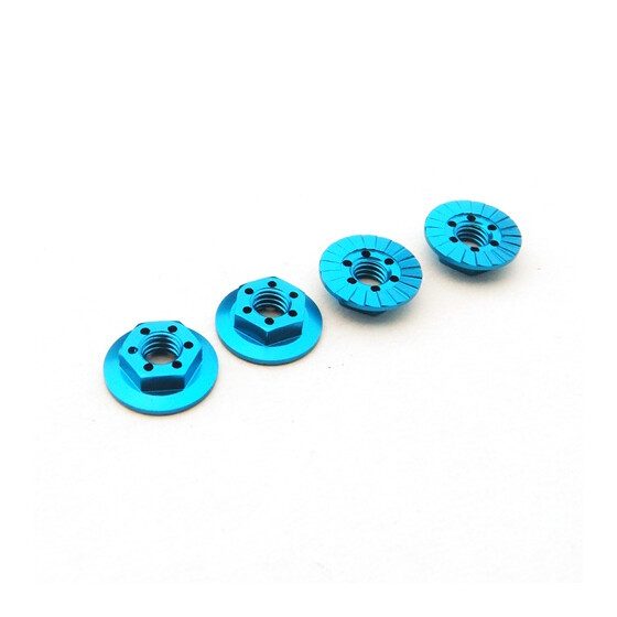 Juego de 4 tuercas de rueda M4 de aluminio de alta calidad de Hiro Seiko. Estas tuercas están diseñadas con un acabado dentado para un mejor agarre y fijación en la llanta, evitando que se aflojen con la vibración. Su diseño fino de 11 mm las hace ideales para aplicaciones en coches RC donde se requiere un ajuste seguro sin añadir peso extra.