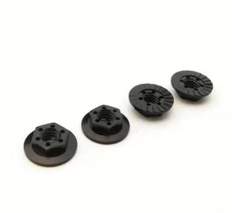 Juego de 4 tuercas de rueda M4 de aluminio de alta calidad de Hiro Seiko. Estas tuercas están diseñadas con un acabado dentado para un mejor agarre y fijación en la llanta, evitando que se aflojen con la vibración. Su diseño fino de 11 mm las hace ideales para aplicaciones en coches RC donde se requiere un ajuste seguro sin añadir peso extra.