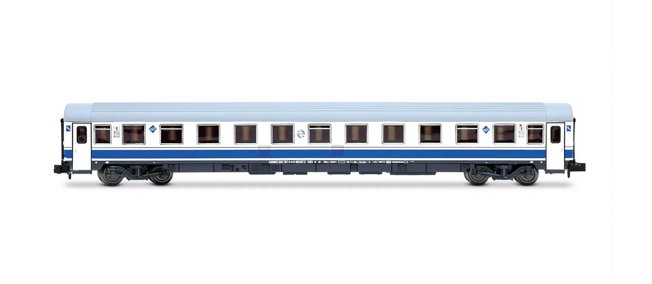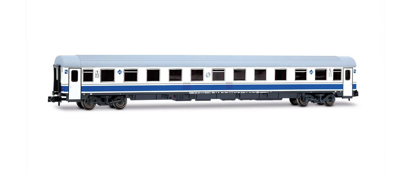 El vagón Arnold HN4459 reproduce el coche superreclinable A8Lv-10501 de RENFE en su característica librea Largo Recorrido de la época V. Estos vagones, introducidos para modernizar la flota de trenes nocturnos y de larga distancia, ofrecían asientos superreclinables que proporcionaban mayor comodidad durante los trayectos nocturnos, representando una evolución significativa en el servicio al viajero durante la década de 1990.