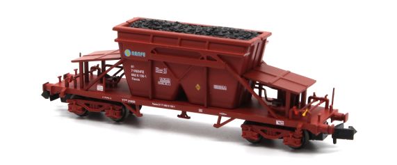 Vagón Tolva Serie TT9 / Faoos: Representa los robustos vagones tolva utilizados por RENFE para el transporte de grandes volúmenes de mercancías a granel, como carbón, mineral o balasto.