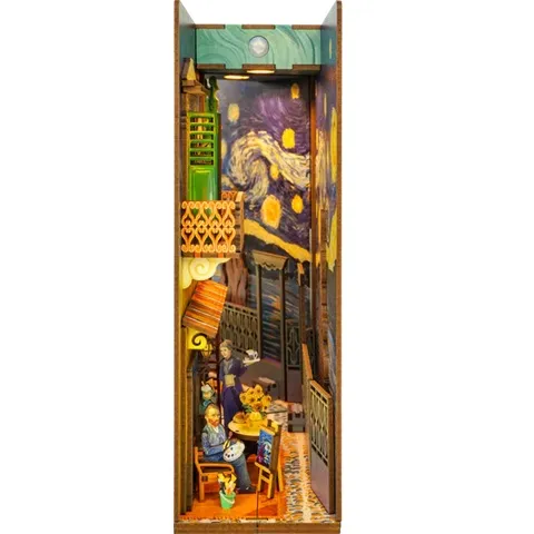 Kit de construcción de un "Book Nook" o rincón para libros, inspirado en el mundo del famoso pintor Vincent Van Gogh. Este diorama en miniatura reproduce una escena de un callejón francés donde Vincent pinta sus emblemáticos girasoles, con la noche estrellada de fondo. Realizado con piezas de madera contrachapada de abedul cortadas con láser, ofrece una experiencia de montaje creativa y gratificante, resultando en una decoración única para tu estantería.