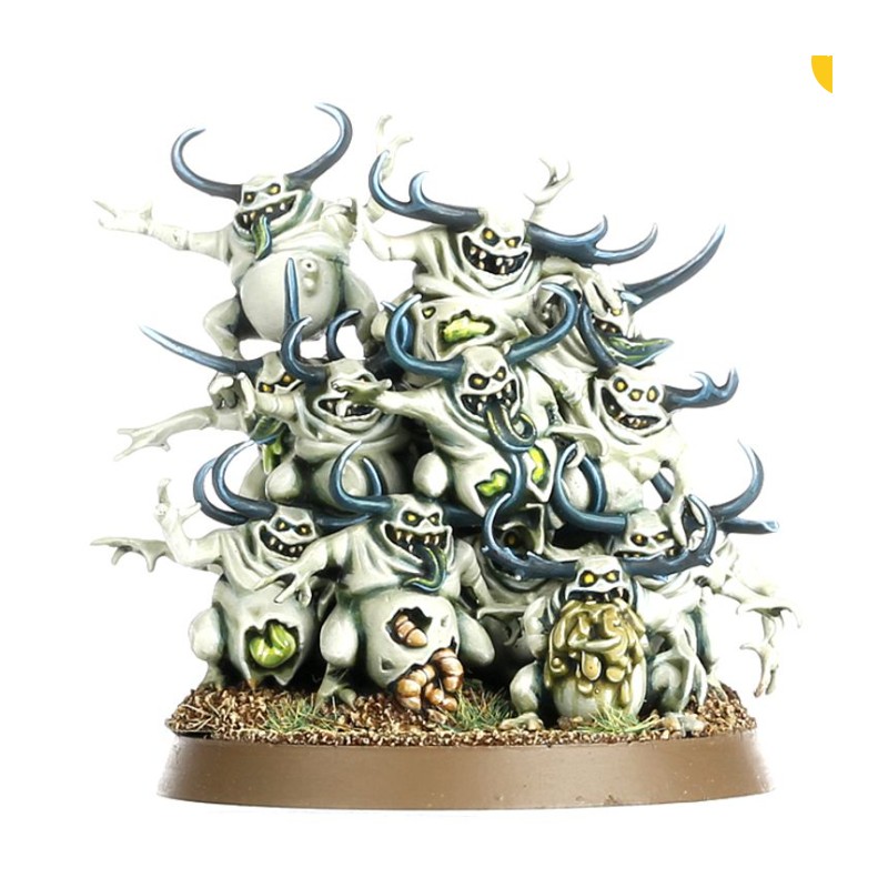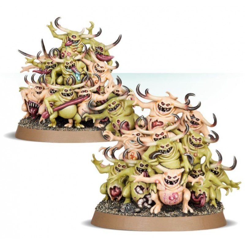 Estas pequeñas diabólicas criaturas son las favoritas del Gran Padre Nurgle, Dios de la Plaga y la Decadencia. Los Nurglings son traviesos, juguetones y absolutamente repugnantes, disfrutando contagiando enfermedades y causando estragos entre las filas enemigas mientras ríen con sus vocecillas agudas.